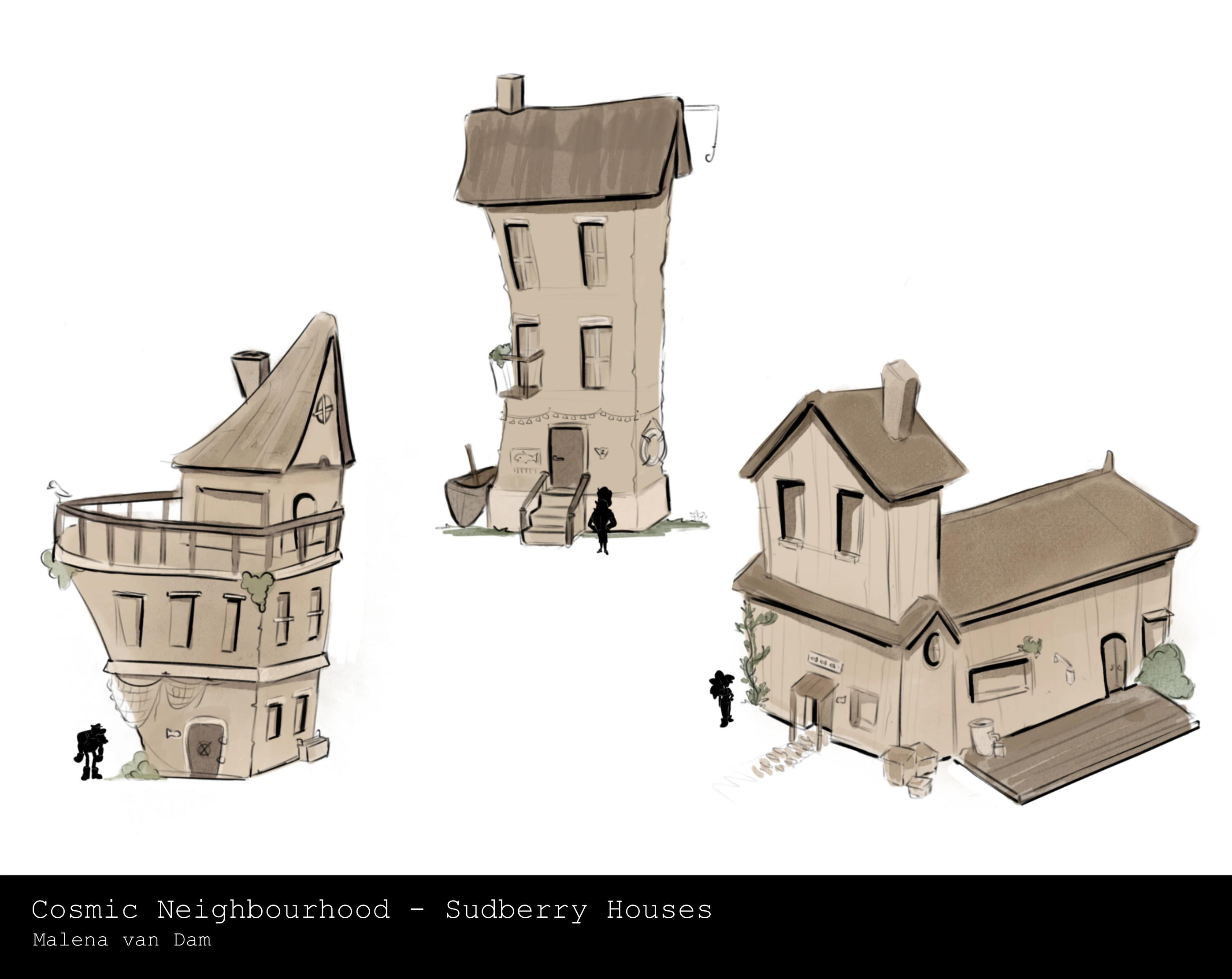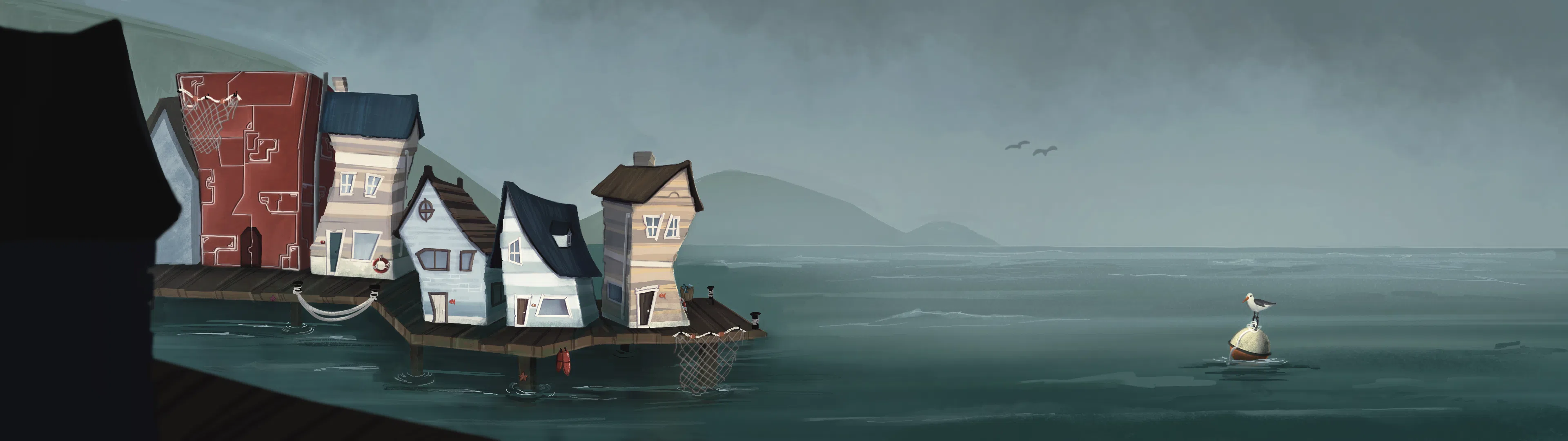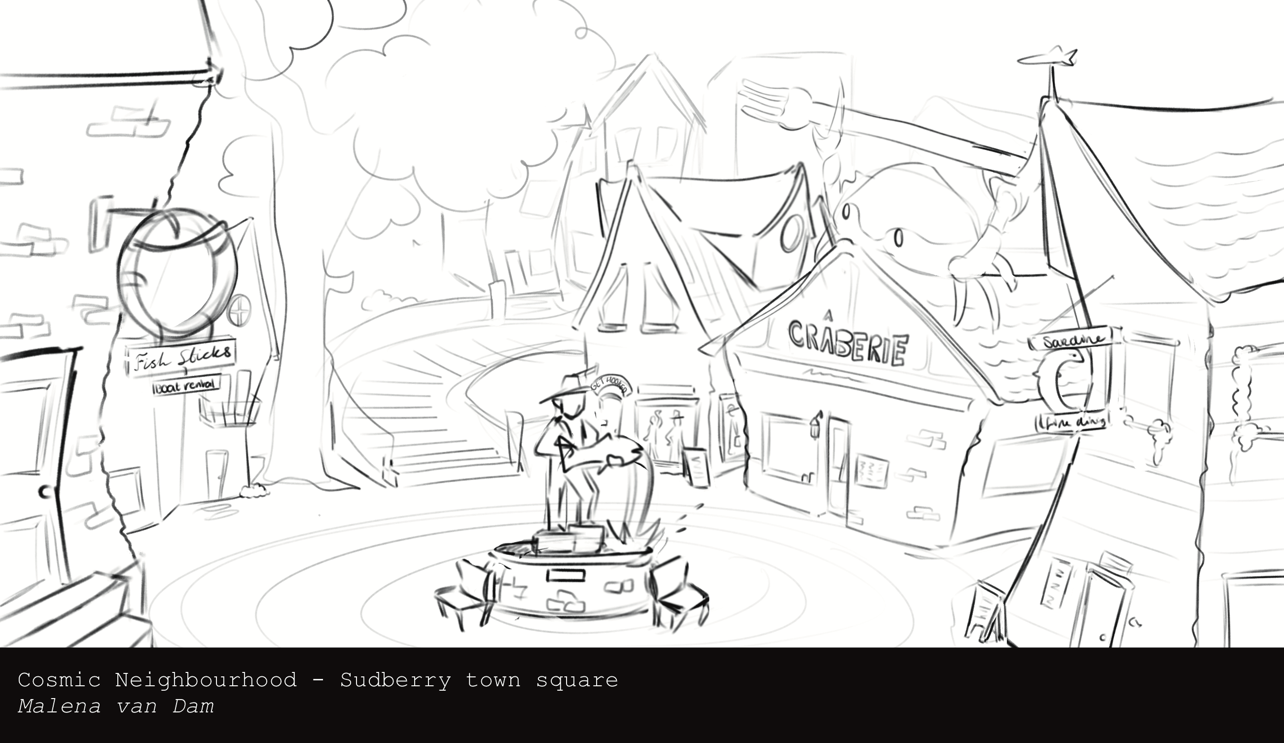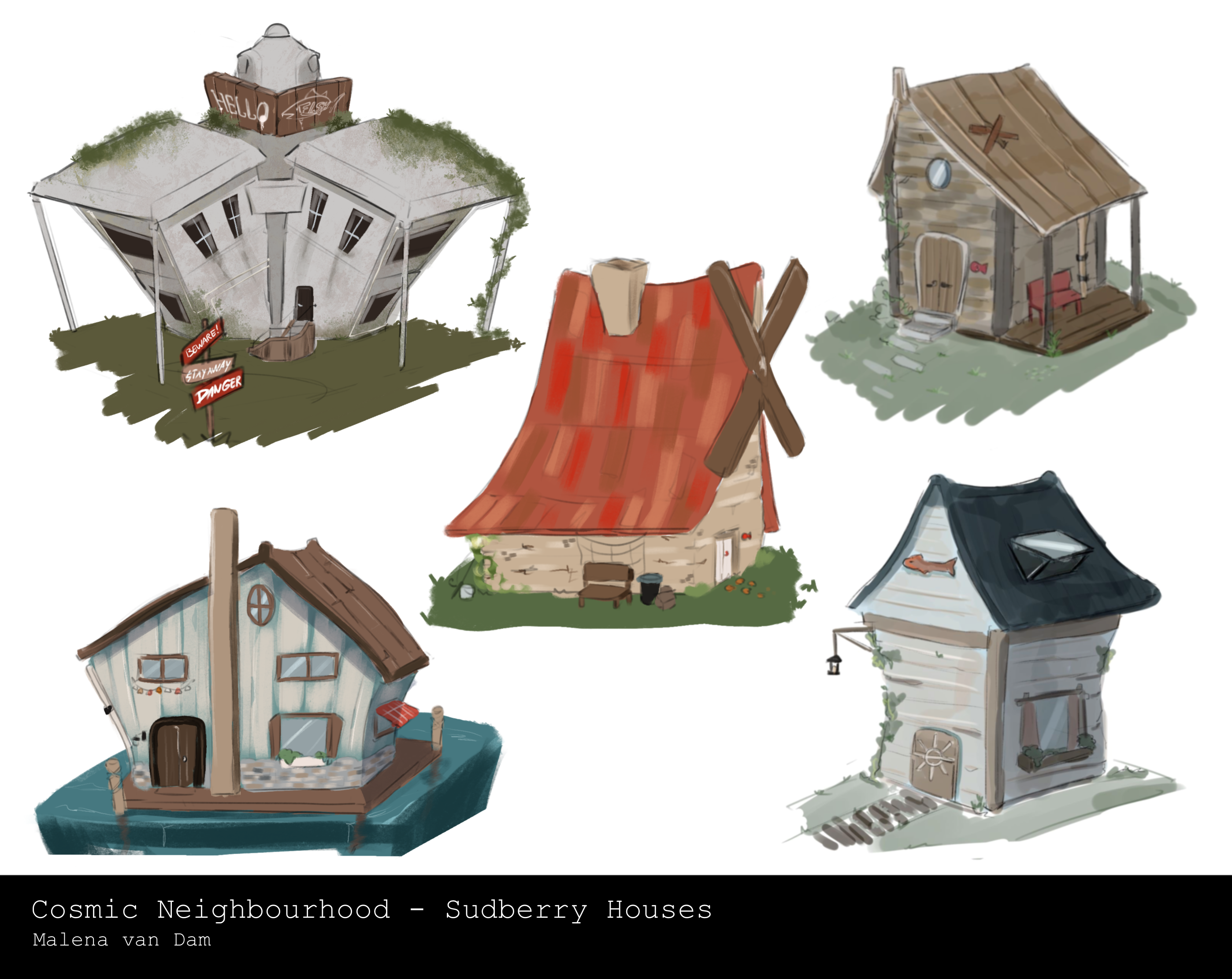 Let’s explore Sudberry! To an outsider, Sudberry looks like any other coastal town quiet, a little odd but harmless enough. The human houses have wonky shapes and sometimes have the silhouettes of ships and boats, to really exaggerate the fishing business. I love to add little inside jokes and puns.