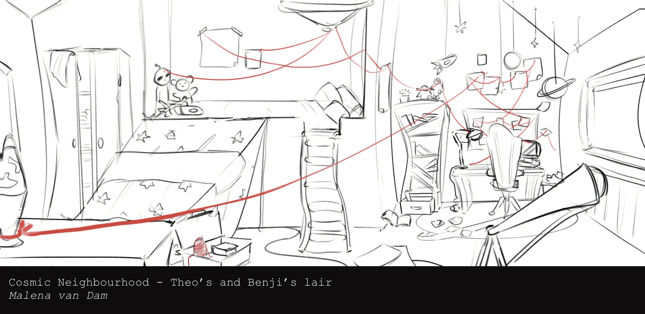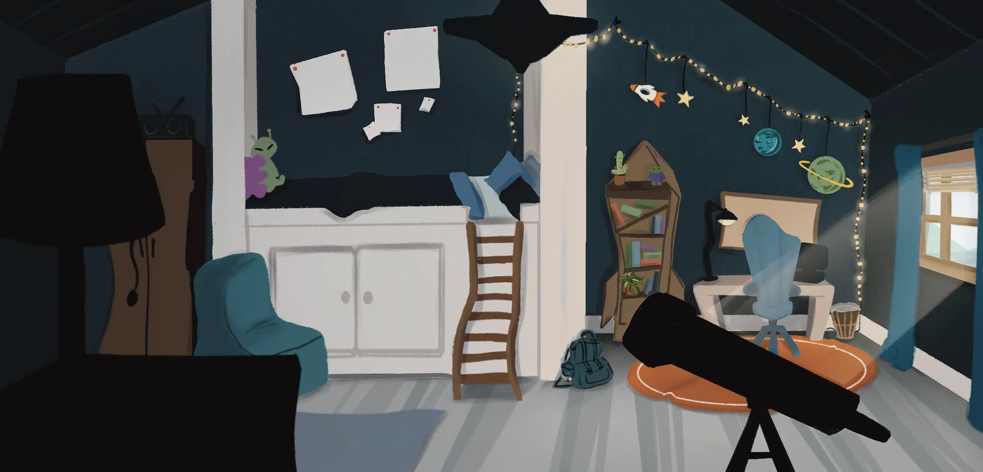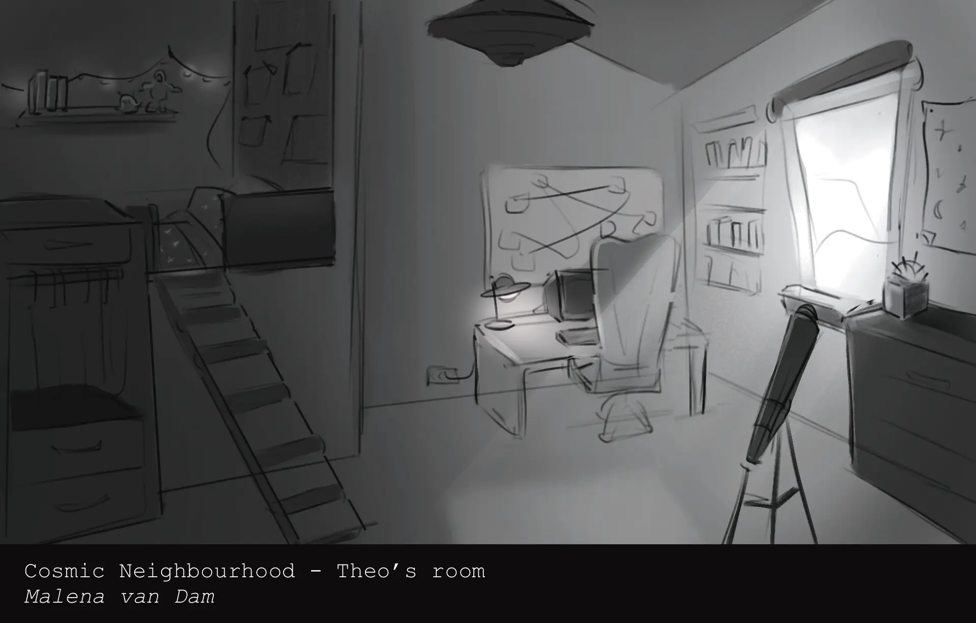 The world of Cosmic Neighbourhood takes place in a small fishing town, called Sudberry, that thrives on their fishing businesses. It’s between the mountains and located on the coast. It’s very hidden and thus the perfect place for the aliens to hide. For this project I designed the bedroom of one of the main characters, Theo Holden. This 14-year old kid is obsessed with the galaxy and all its mysteries, so I let that play a major role in the process of designing. Theo’s room, or better known as ‘the hide-out’, glows softly under a string of Christmas lights that gives the effect of tiny little stars.